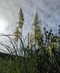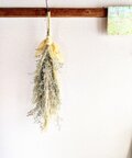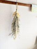 ハーブ畑で育てたパンパスグラスと、ブルーファンタジーを使った秋色の縦長スワッグです。