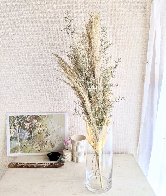 黄金色のパンパスグラスと、淡いブルーファンタジーを組み合わせ、ふんわりとしたテイストにしました。