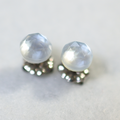 真珠のような光沢をもつホワイトシェルに、スカイブルートパーズのラウンドカットを貼り合わせてつくられた、手の込んだカボションを使ったスタッドピアスです。