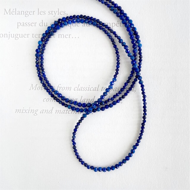 アフガニスタン産の3mmと4mmの2種のラピスラズリを等分につなげたブレスレットにも使えるロングネックレス。