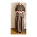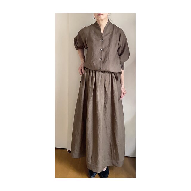 テンセル53%リネン47%、カーキ色の少し光沢感もあり柔らかな生地感です。