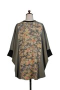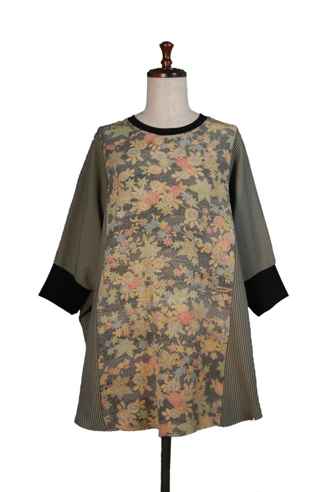 紅葉や花の総柄染色生地とストライプの男物着物生地、二着の着物生地を組み合わせて創ったチュニックとなります。
