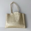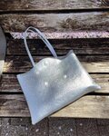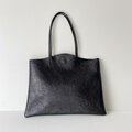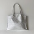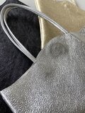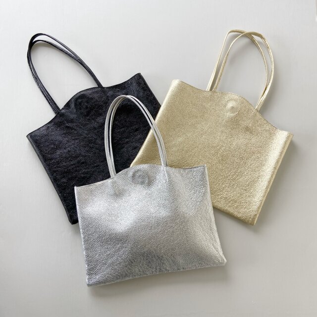 このトートバッグは、立体的でキラキラとした表面が特徴のピッグレザーを一枚仕立てで使用しています。