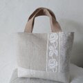 ドット刺繍リネン、京都のリネットさんのリネンのヘリンボーンなどを配したナチュラルな雰囲気のバッグです
