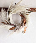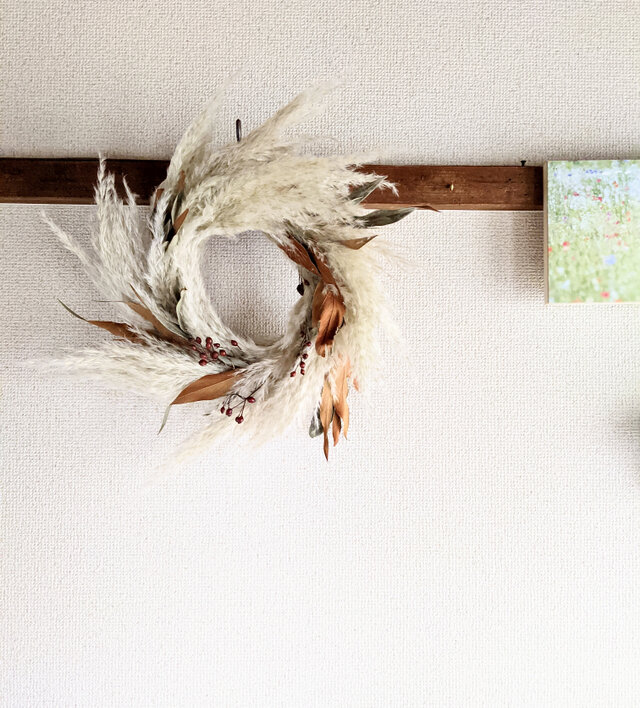 今季収穫のパンパスグラス、ブレアビアゴールド、野バラの実などを使った秋感じるドライフラワー・リースです。