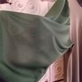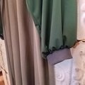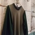 カーキカラーのさらっとしたカットソー生地にグリーンの少し光沢のあるトロッとしたポリエステルのパフスリーブを付けました。少しだけ透けてかわいいです。