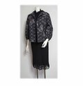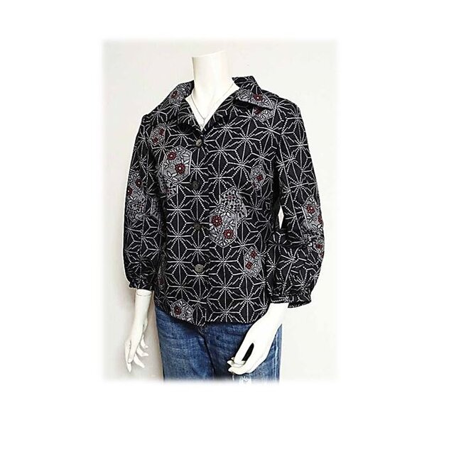 12*大島紬リメイクレトロオープンカラーブラウスジャケット(黒/麻の葉と亀甲と花)