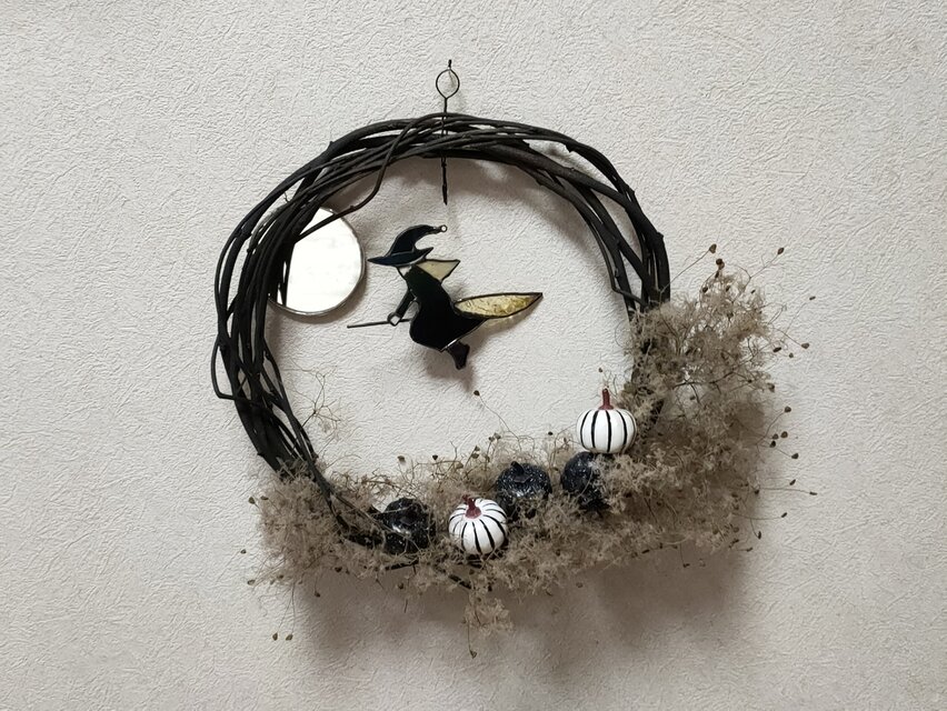 黒いツルのリースにステンドグラスの魔女を下げています。