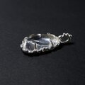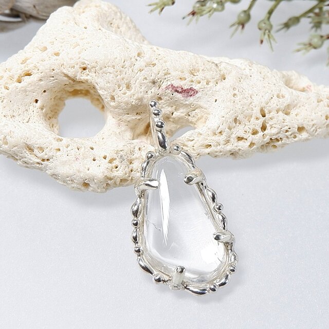 山梨県にある乙女鉱山産の水晶を磨き、石枠の縁やバチカンに粒飾りを付けた個性的なペンダントに仕上げました。
