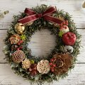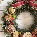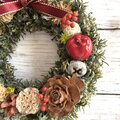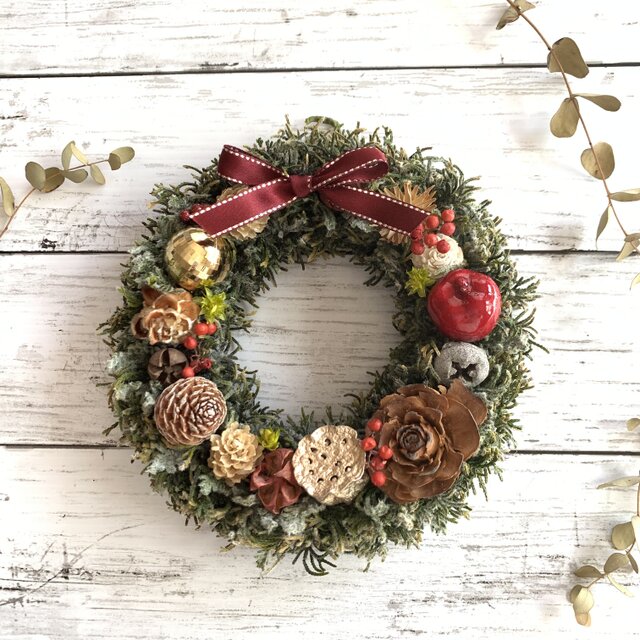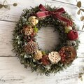 深紅のリンゴと色んな木ノ実をギュッと詰め込んで、ラメ入りリボンでキュッと結んだクリスマスリースです。