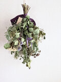 ハーブ畑で育てたユーカリポポラス、ブルーブッシュ、オレガノやアメジストセージなどハーブを使ったドライフラワースワッグです。