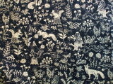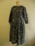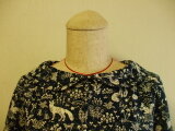 紺地×白動物柄プリント 綿麻 丸衿長袖のワンピース Lサイズ 受注生産