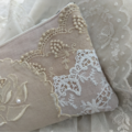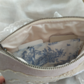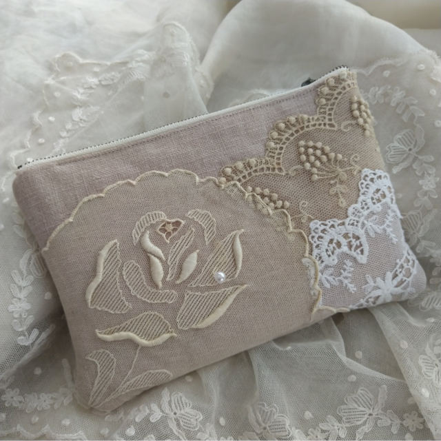 エクリュリネンにアンティークレースをのせたファスナーポーチ