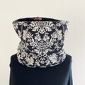 ダスマスク柄/模様/白黒/モノトーン/スヌード/ネックウォーマー/マフラー/ストール/首元/おしゃれ/アクセント/素敵/大人/上品/コーデ/巻物/あたたかい/冬/秋/春/ファッション/レディース/コーディネート/冷房対策/冷え予防/冷え対策/ギフト/贈り物/プレゼント/20代/30代/40代/50代/60代/70代/80代/年齢問わず/お出かけ/旅行/ヨーロッパ/高貴/気品/高級感/モード/手作り/ハンドメイド/防寒アイテム