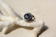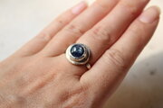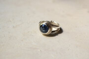 青い石カイヤナイトを覆輪留して、周囲に丸の刻印を入れてます。