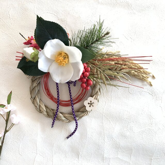 直径16cmの稲わらのしめ縄に花材をつけています。