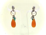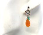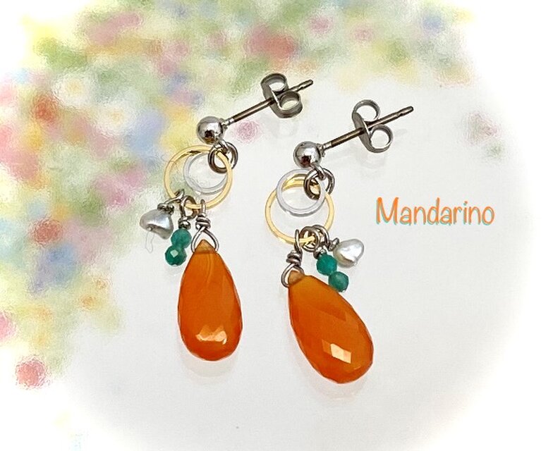 甘~い蜜柑のしずくのモチーフピアスです。美しく二つ揃ったカーネリアンのドロップに、アマゾナイトとアコヤケシを添えて。お洒落なシルエットに揺れるオレンジが映える一品になりました。