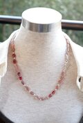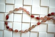 今回は長さ10mm程度の楕円形の石たちです。薄いピンク色からまろやかな赤色まで、気持ちを優しく癒してくれるようなとても美しいお色目の石が連なります。