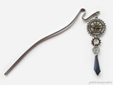 色違い、形違いの歯車とダークインディゴ色のアクリルビーズが揺れるアンティーク調の簪(かんざし)です。