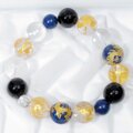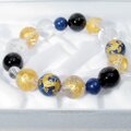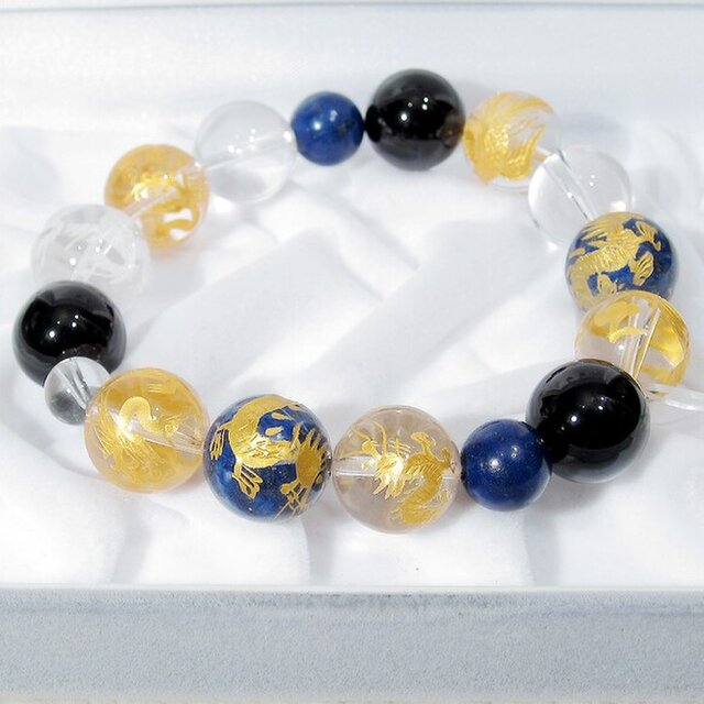 大粒の天然石に四神(青龍、白虎、朱雀、玄武)が彫られたブレスレットです。色合いの鮮やかなラピスラズリや、光沢感の美しい水晶やオニキスを使っています。