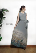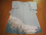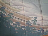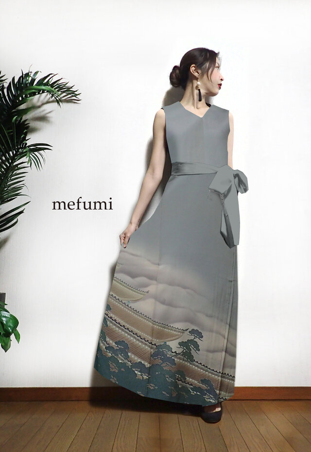 繊細で美しく、千草色 (ちぐさいろ)の優美な雲海に松から見上げるお城が風情あふれる上質さを加味しだす、素敵なアンティーク着物をほどいて、画像デザインのフォーマルワンピースをお作りいたします。
