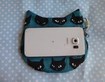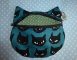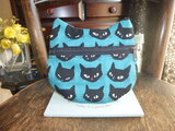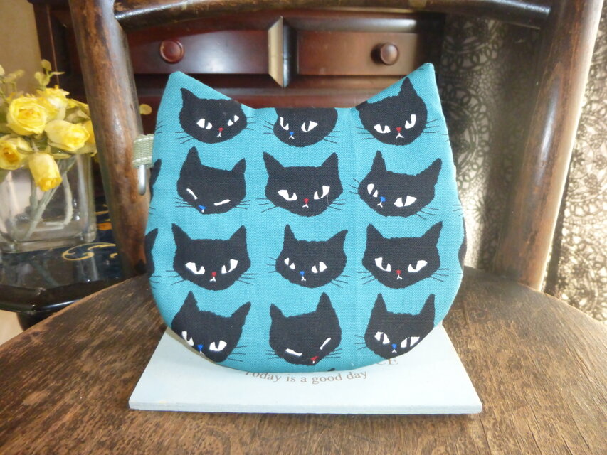 青緑色の黒猫さんプリントのオックス地で作った猫型のポーチです。
