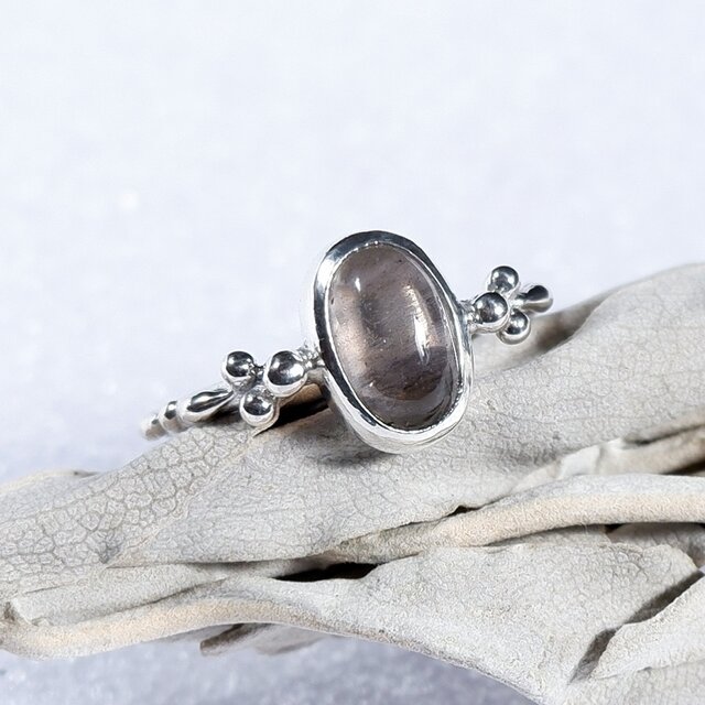 インドネシア ジャワ島で産出するアグニマニタイトの原石を磨いて粒飾りの華奢なリングに仕上げました。