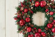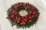 ソフトヒムロスギをベースにして、アーティシャルフラワーのリンゴをメインに、メタコイセイアやアスター(八角)、ブラックベリーなどで制作したクリスマスリースです。