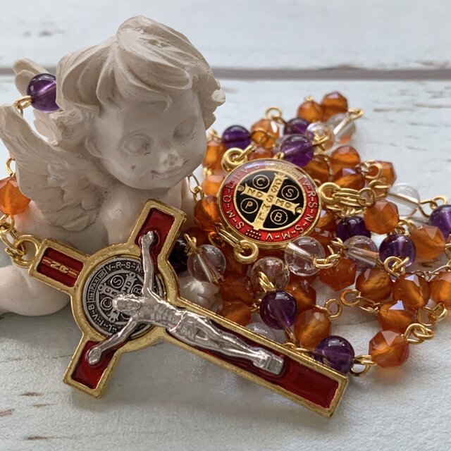 カーネリアンとアメジスト、本水晶を使用したロザリオです。