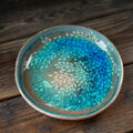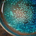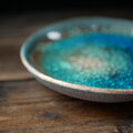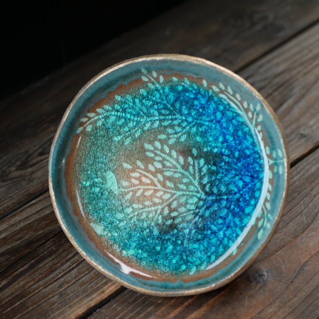陶土の上にガラスを溶かした水たまりの様なお皿です。