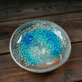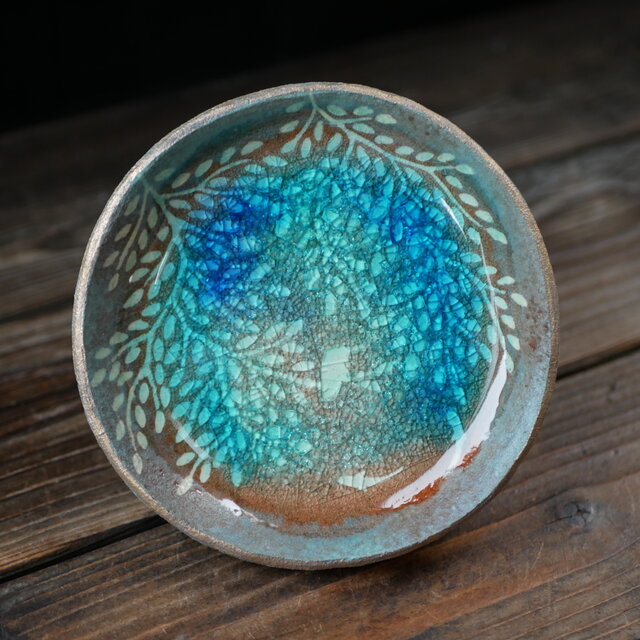 陶土の上にガラスを溶かした水たまりの様なお皿です。