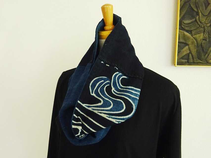 筒書きと無地木綿を繋いだ布を見つけたので更に不足分を足してスヌードにしてみました。