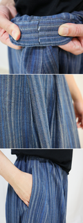 画像では分かりにくいですが、インディゴ、ブルー、ブラウン、ベージュ4色の糸で織りなす太さの異なる縦縞模様が綺麗です。