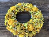 鮮やかな黄色のヘリクリサムをメインに、スカビオサ、ダイヤーズカモミール、スターチス、タンジー、ヤロー、スターフラワー、グロボーサ微かな色の違いの素材の組み合わせを華やかさをお楽しみください。