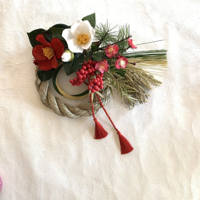 紅白の江戸椿を正面に、緑と金の水引がしっくりと映える大きめのお正月飾りです。