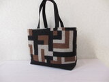 黒色と茶系との3色からなるジャガード織り,幾何学模様の生地で少し大きめなトートを作成しました。