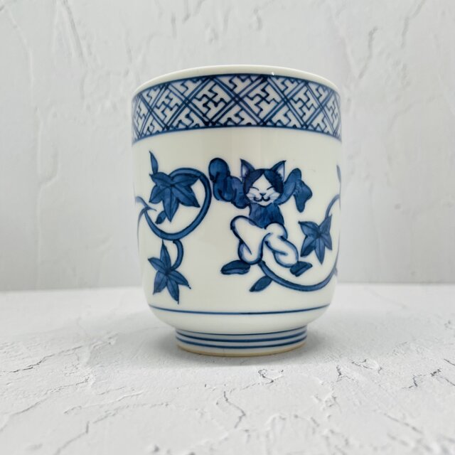 磁器の湯呑みに2匹のネコ唐子が遊んでるところを描きました。
