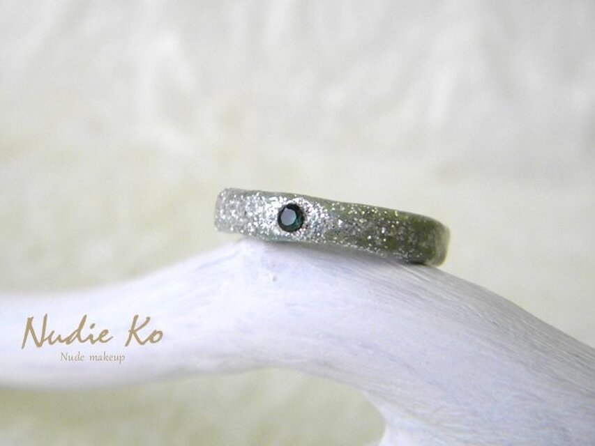天然石は、グリーントルマリンのメレルースを合わせました、濃いグリーンの色合いです。淡いモスグリーンの和紙リングに純銀ラメが降り積もって、キラキラと輝きます。
