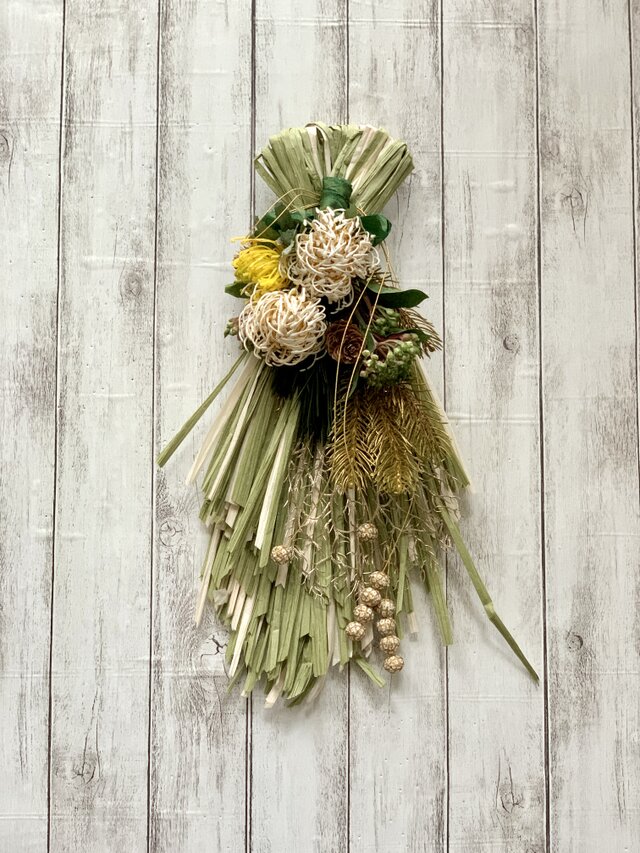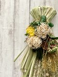 白と黄色の菊とマツボックリと松のしめ縄飾りです。