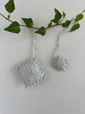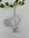 生成りリネン生地に水色でハーダンガー刺繍をして、中に乾燥ラベンダーを入れてます。