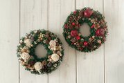 ソフトヒノキのグリーンをベースに、赤いリンゴやプリザーブドフラワーのカスミソウ、ドライフラワーのヤシャブシなどで制作した小さめのクリスマスリースです。