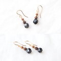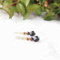 大きめのカットが入った漆黒のオニキスにナチュラルなウッドビーズを合わせ、アクセントにゴールド色のヘマタイトを添えたシックな雰囲気のピアスです。