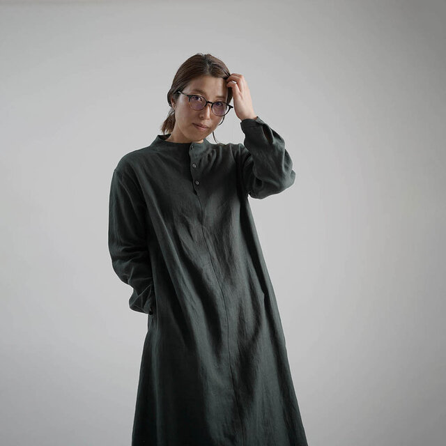 着た感じゆるっとルーズな印象でとても素敵なワンピです。着丈はふくらはぎ3分の2くらいの辺り。袖丈は手の甲がすっぽり隠れるくらい。緩めのボトルネックが首をほっそり見せてくれました。