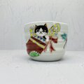 磁器の蕎麦猪口にクリスマスの靴下にプレゼントと一緒に入り込む猫を描きました。