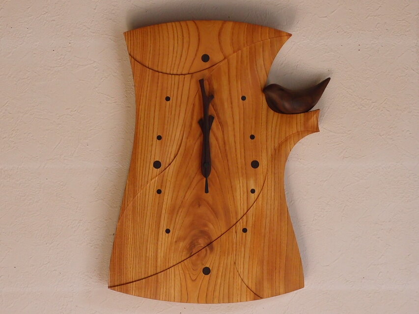 森の空気感を感じるとっても素敵なお作品です!電波時計ですが、枝の針が時をやわらかく知らせてくれるという、少しのゆとりがあるところが魅力的です!小鳥の手触りも抜群で、杢目や彫りがより立体的に感じます!出逢いに感謝と感激をしております!
