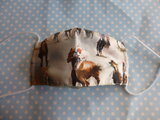 競馬柄のコットンブロード地を使っています。(綿100%ではないかもしれません。一般のコットンブロードより目が細かいです。)馬好きの方は多いのですが、馬柄の生地は珍しく見つけると購入して製作していますがすぐに売り切れてしまいます。今回もちょっと予算オーバーでしたがカッコイイ競馬柄の生地と出会ってすぐ買ってしまいました。