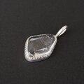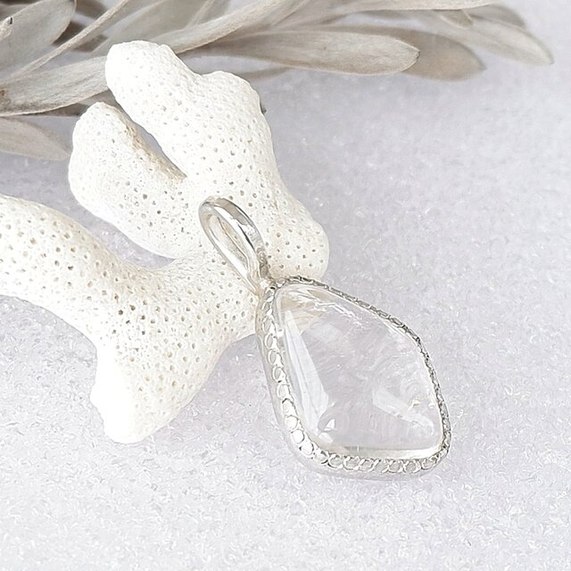 山梨県にある乙女鉱山産の水晶原石を磨き、艶消し枠にミル打ちをしたシンプルなペンダントに仕上げました。