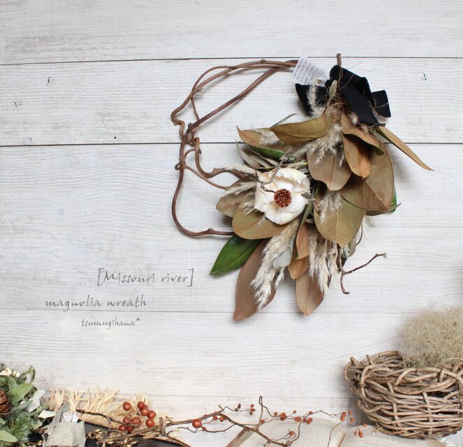 「ミズーリ川の春」wreath タイサンボクとキウイツルのリース ドライフラワーリース パンパスグラス