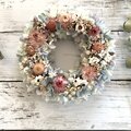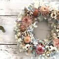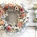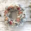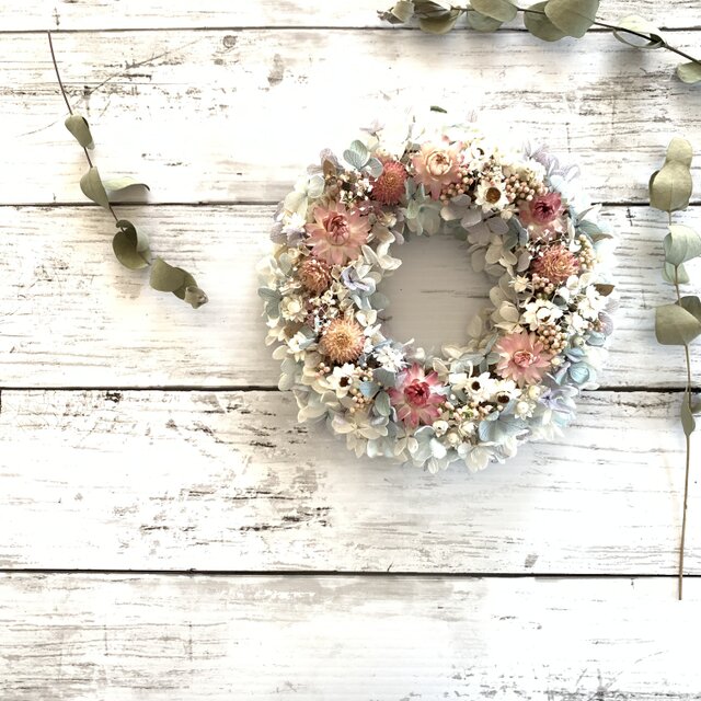 ドライフラワーの花材をメインにプリザーブドフラワーの水色アジサイを使った優しいお色の小さめリースです。