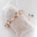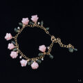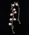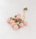 やわらかな冬の陽を思わせるような、丁寧なハンドカットのピンクオパールのばらに、グリーントルマリンを葉に見立ててたっぷりと使い、スイーツを飾るアラザンのようにランダムにパイライトを添えてブレスレットを作りました。